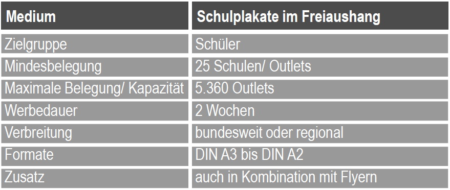 Wir bieten Plakatwerbung in allen Schulformen für die Formate DIN A3 bis DIN A0 an. Hierbei haben wir für die Formate DIN A3 und DIN A0 noch die Möglichkeit die Plakate in Displays (ALU Wechselrahmen / schoolboards) zu präsentieren. Der Werbezeitraum beträgt jeweils 2 Wochen.