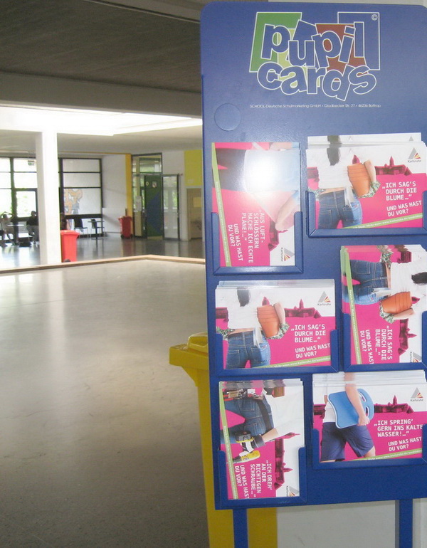 Gratispostkarten sind ein beliebtes Werbemedium – auch mit eingebauten Responseelementen oder QR-Code. Wir bieten Postkartenwerbung mit Metalldisplays und auch in Dispensern in Schulen an. Weiterhin kann ein Kunde bis zu 4 Motive je Schule ohne Aufpreis einsetzen.